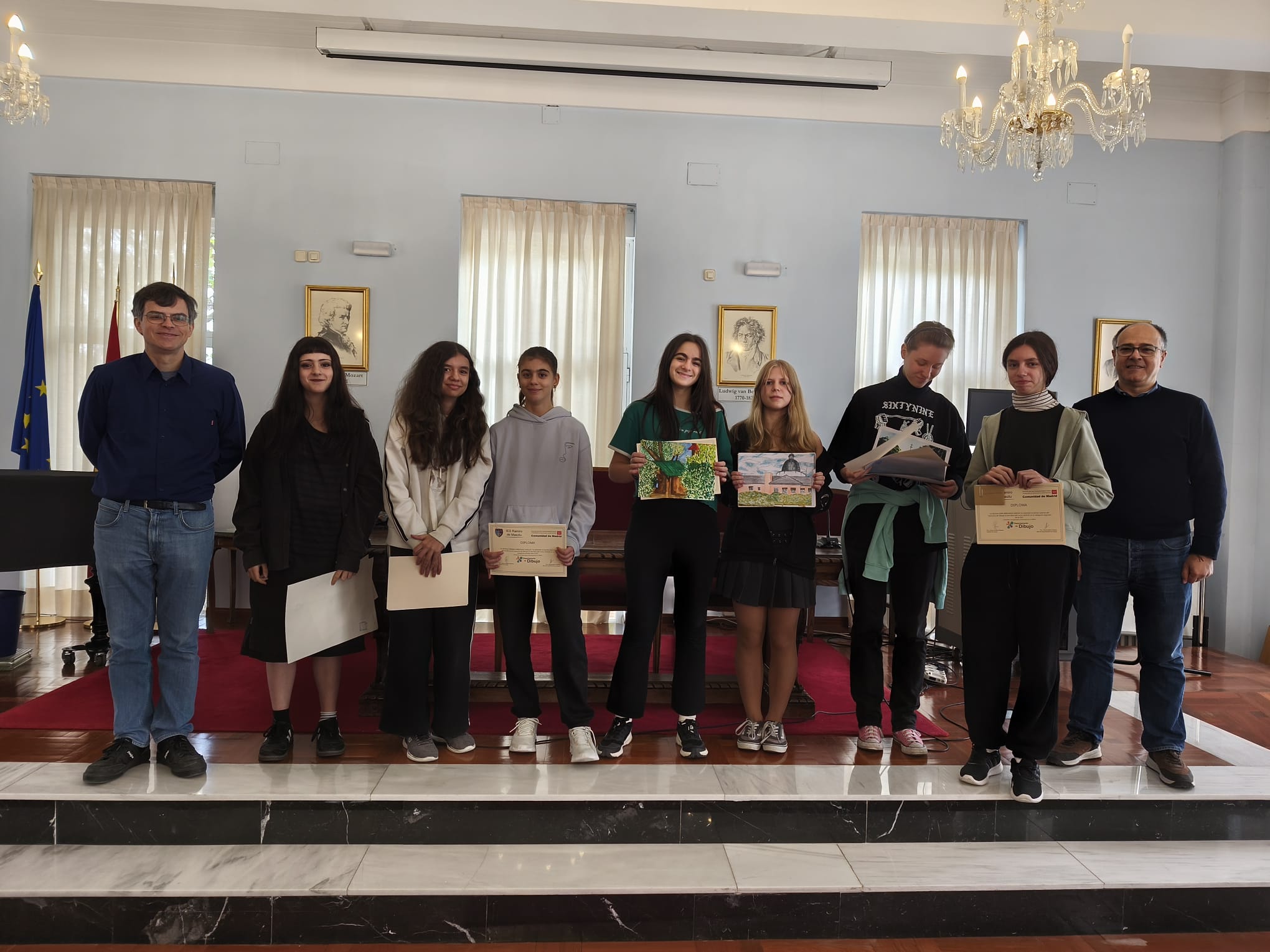 Hoy, 7 de noviembre, de 11 a 11:30h en la Sala de Música del IES, se ha hecho entrega de los premios del Certamen de Dibujo al Aire Libre al que concursan alumnos de 1º y 2º ESO y de 1º y 2º de Bachillerato de Artes. La ceremonia ha contado con la presencia de D. Jesús Almaraz, director del IES Ramiro de Maeztu, el jefe del departamento de Dibujo, D. Alberto Muñiz, y un representante del AMPA.